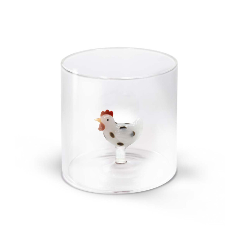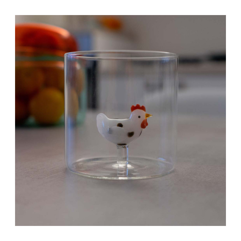 Bicchiere in vetro borosilicato con soggetto in vetro colorato all'interno.