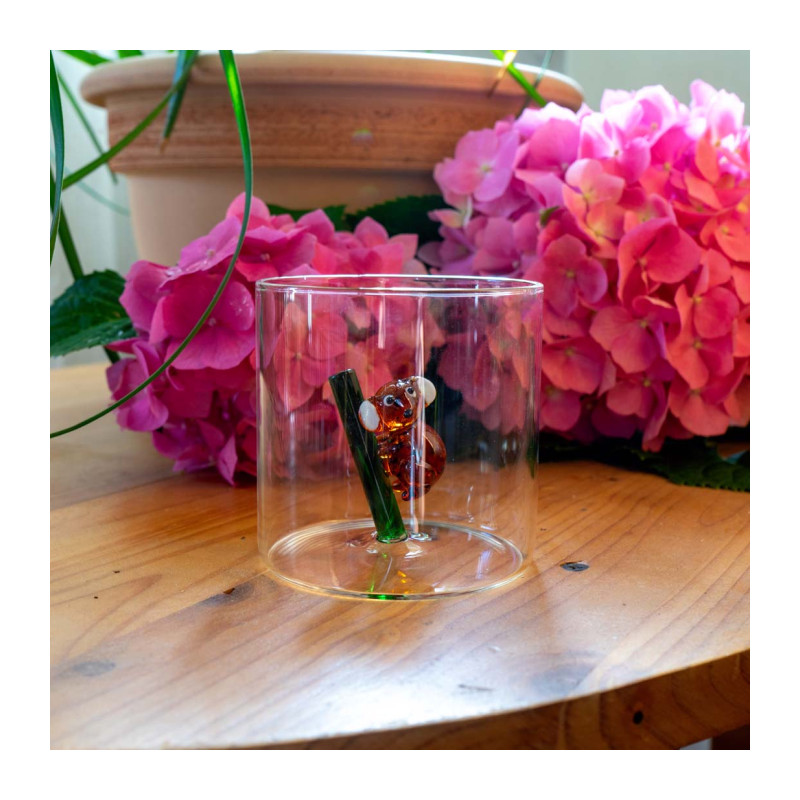 Bicchiere in vetro borosilicato con soggetto in vetro colorato all'interno.
