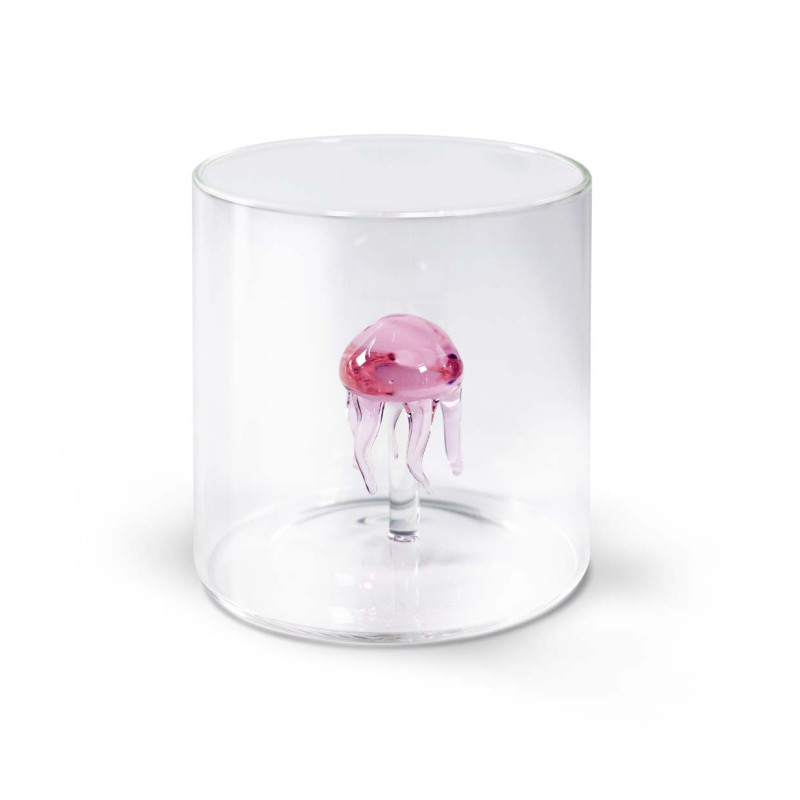 Bicchiere in vetro borosilicato con soggetto in vetro colorato all'interno.