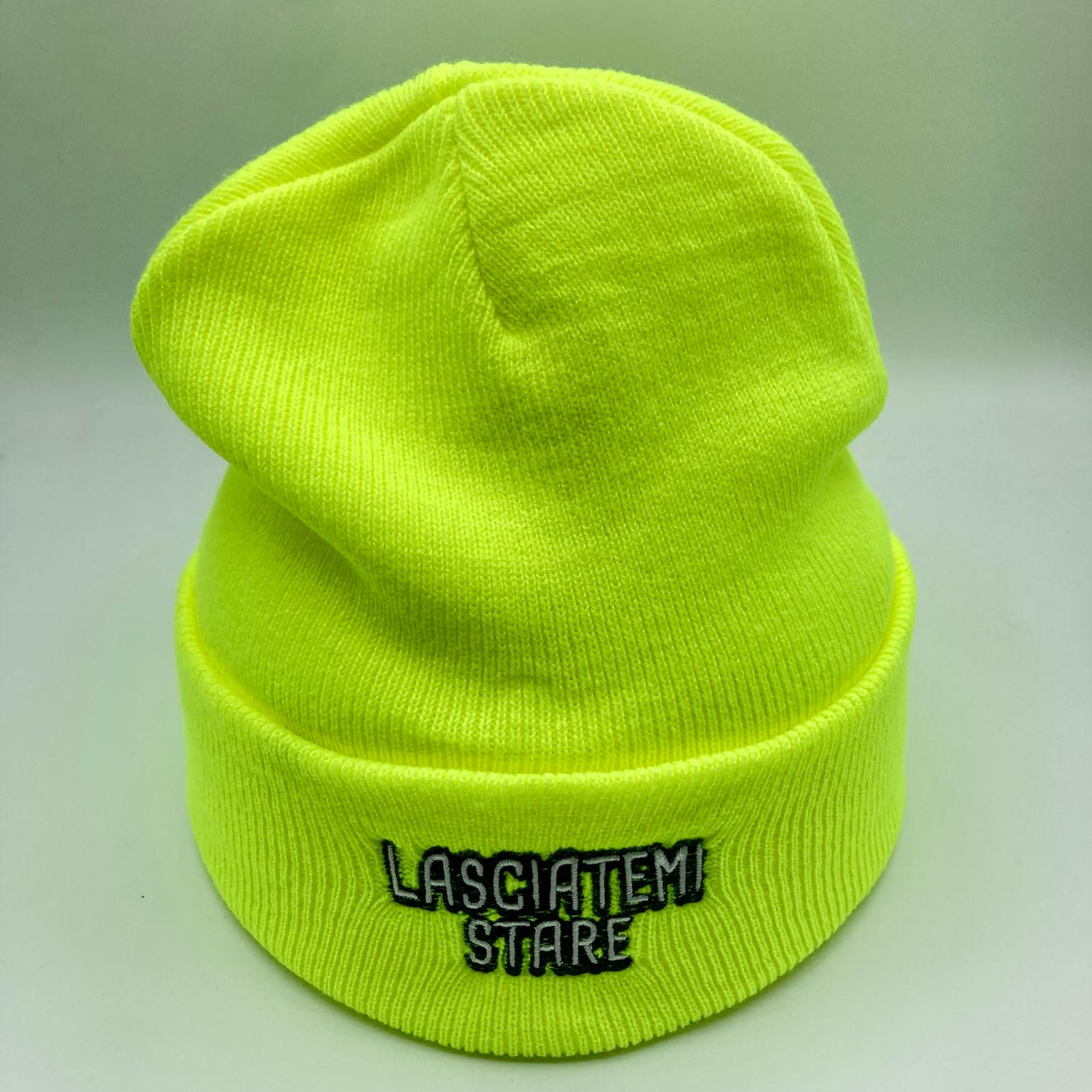 La scritta sul berretto caldo LASCIATEMI STARE è ricamata a filo.