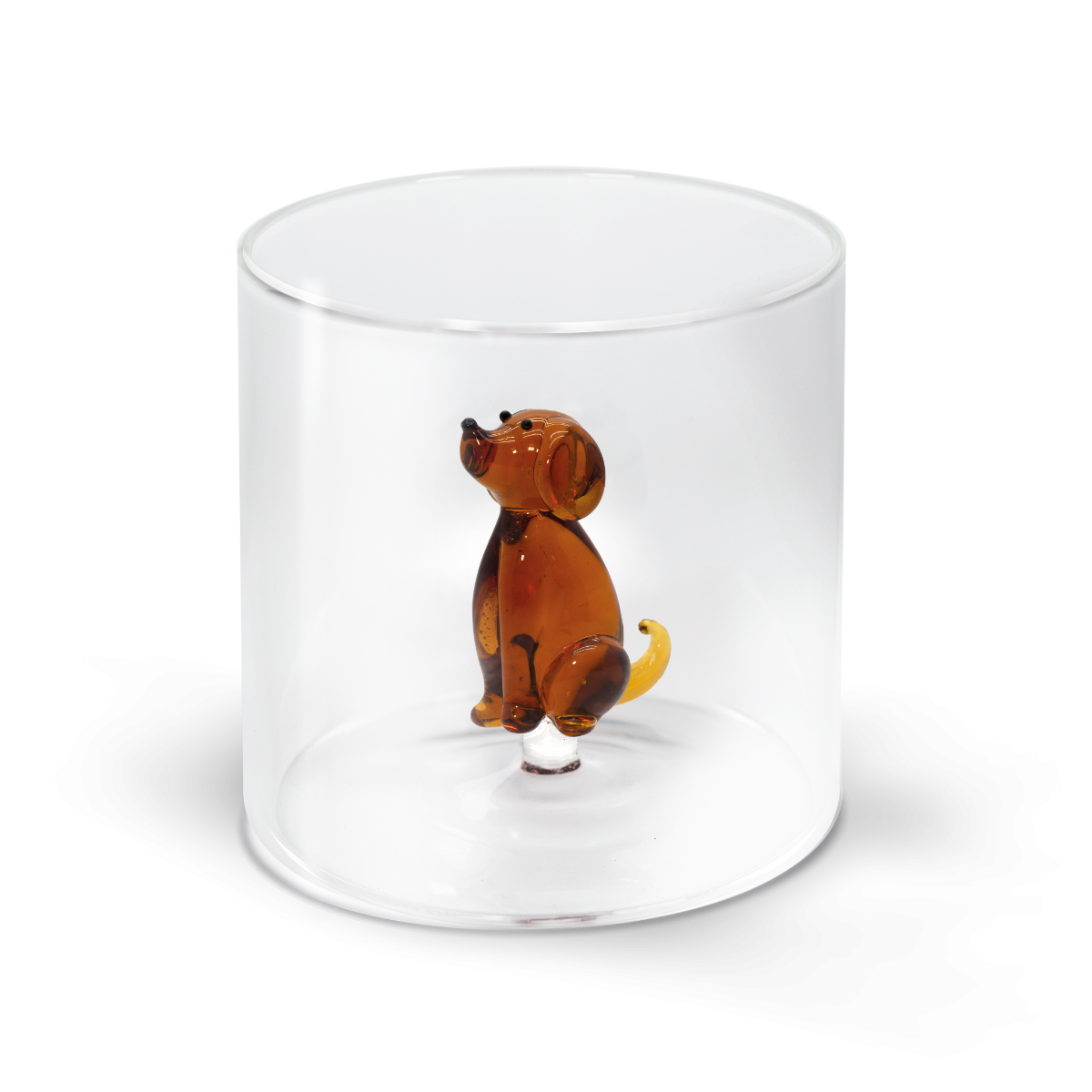 Bicchiere in vetro borosilicato con soggetto in vetro colorato all’interno.