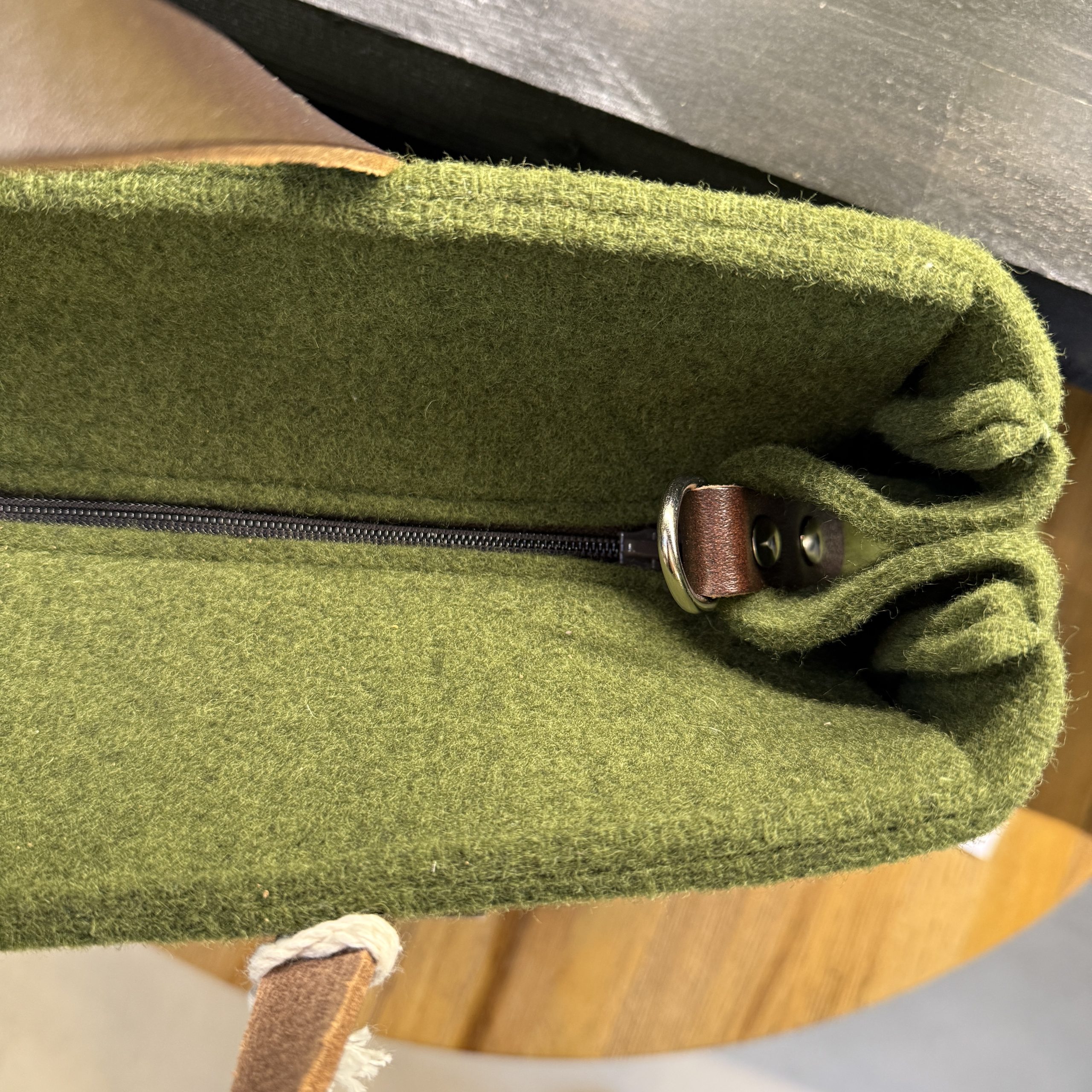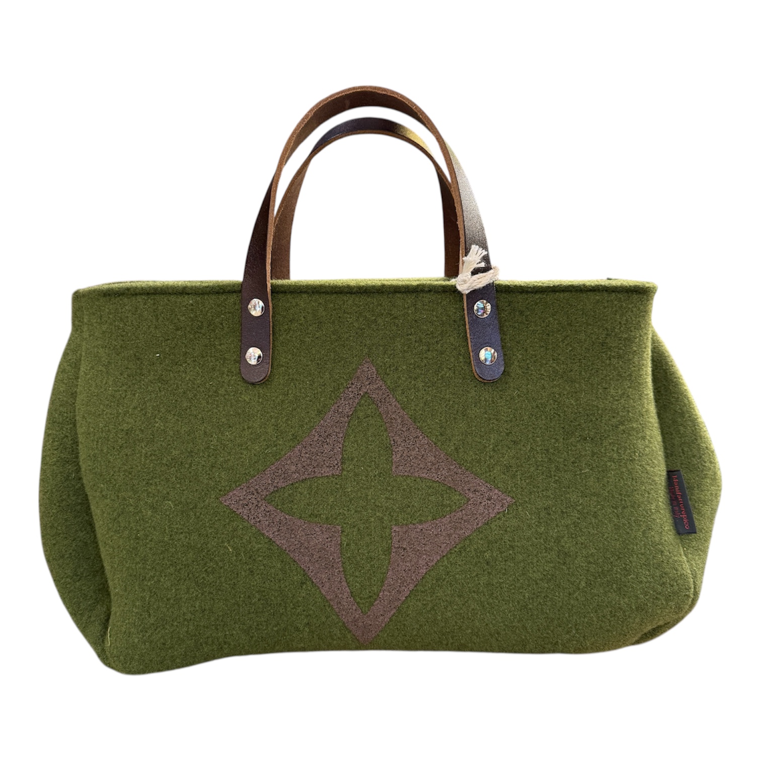 Borse realizzata a mano in feltro con dettagli in pelle e stoffa.