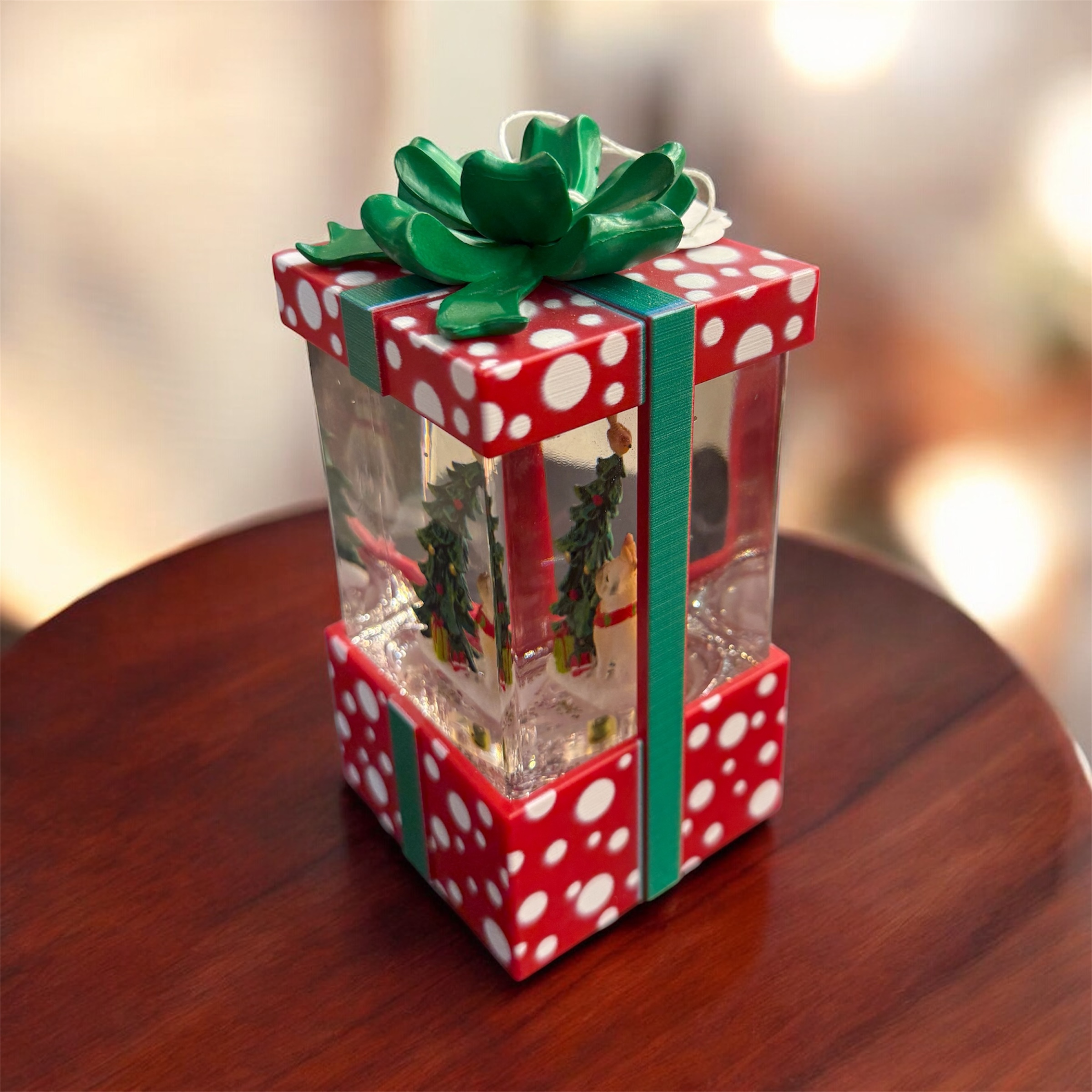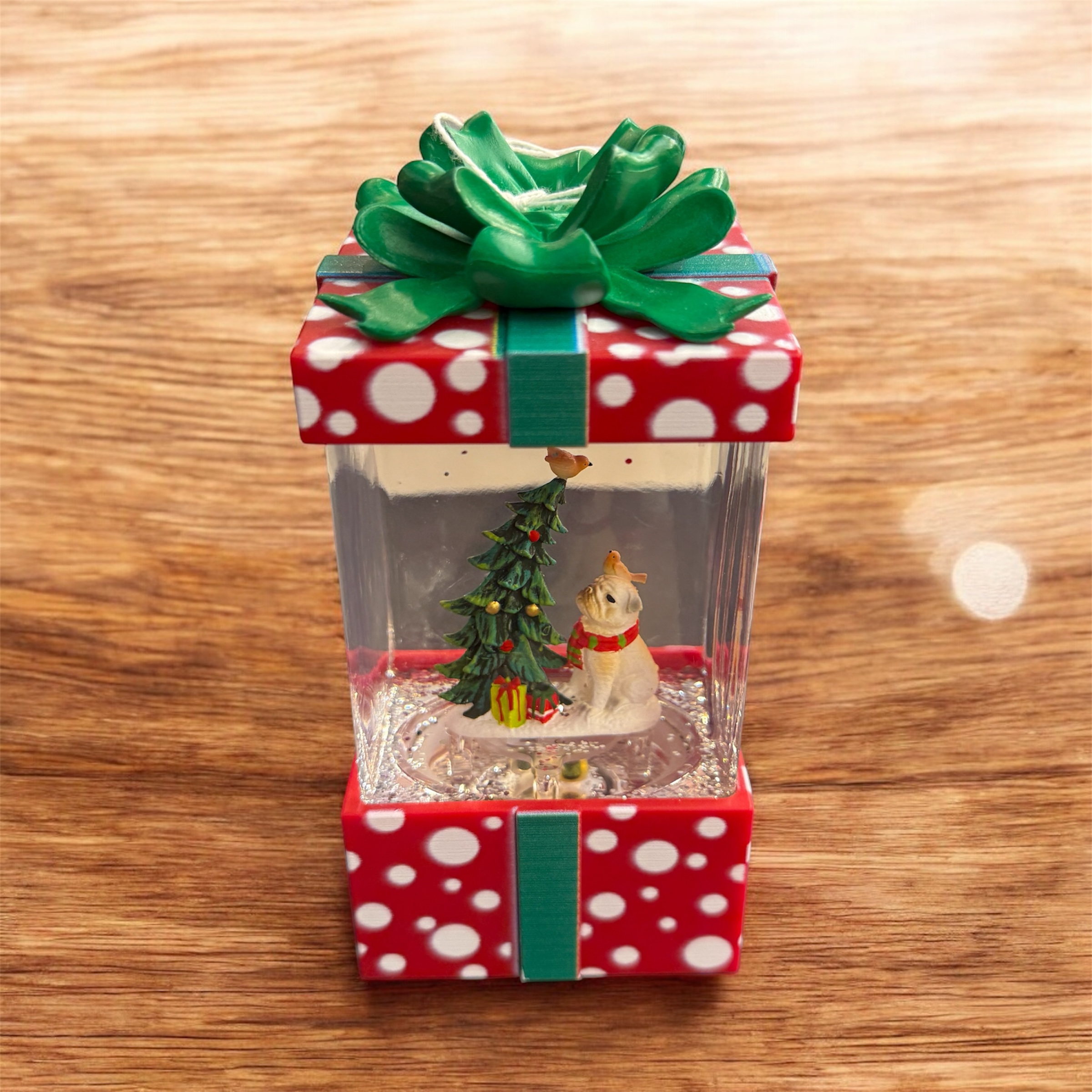 Pacco regalo natalizio con musica e brillantini. All’interno bulldog con albero di Natale.