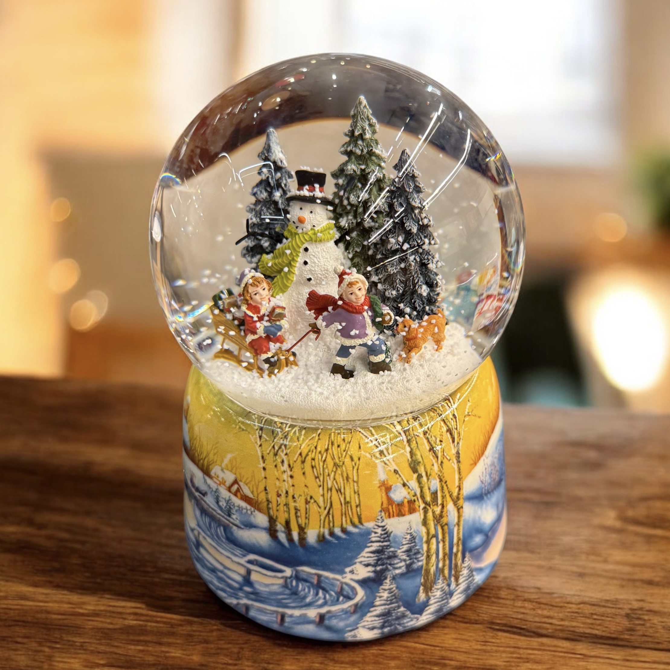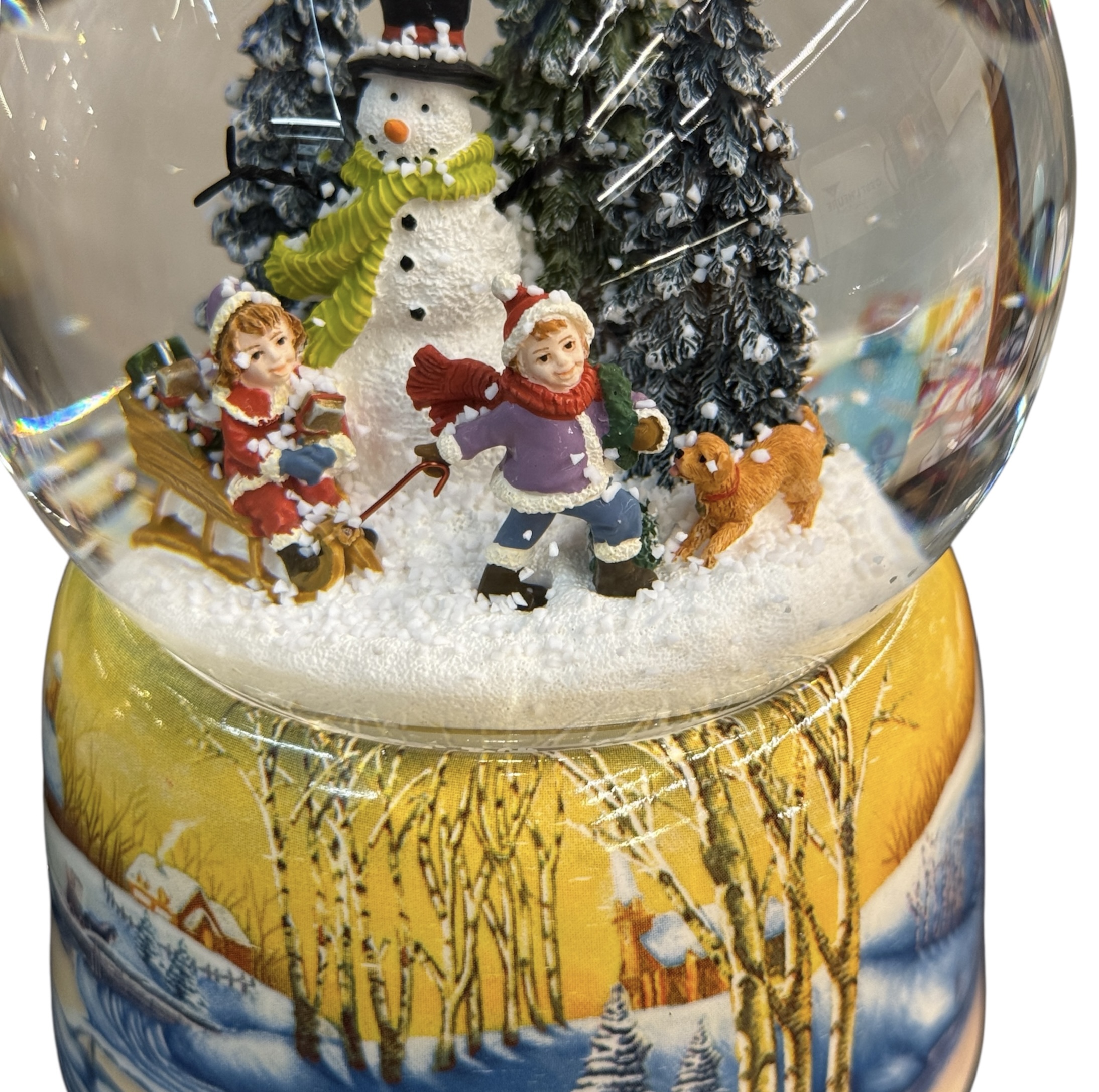 Bellissima palla di neve in vetro con bambini e pupazzo di neve.