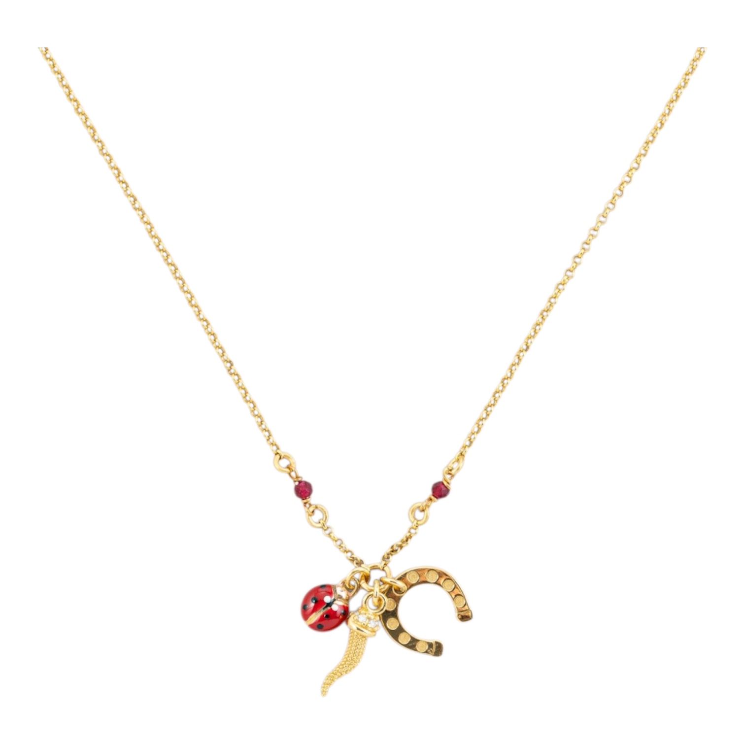 Collana Ciuffetto Coccinella con Ferro di cavallo in argento 925 con galvanica in oro 24Kt, con coccinella rossa smaltato a mano, accompagnato da un cornetto in oro e un ferro di cavallo.