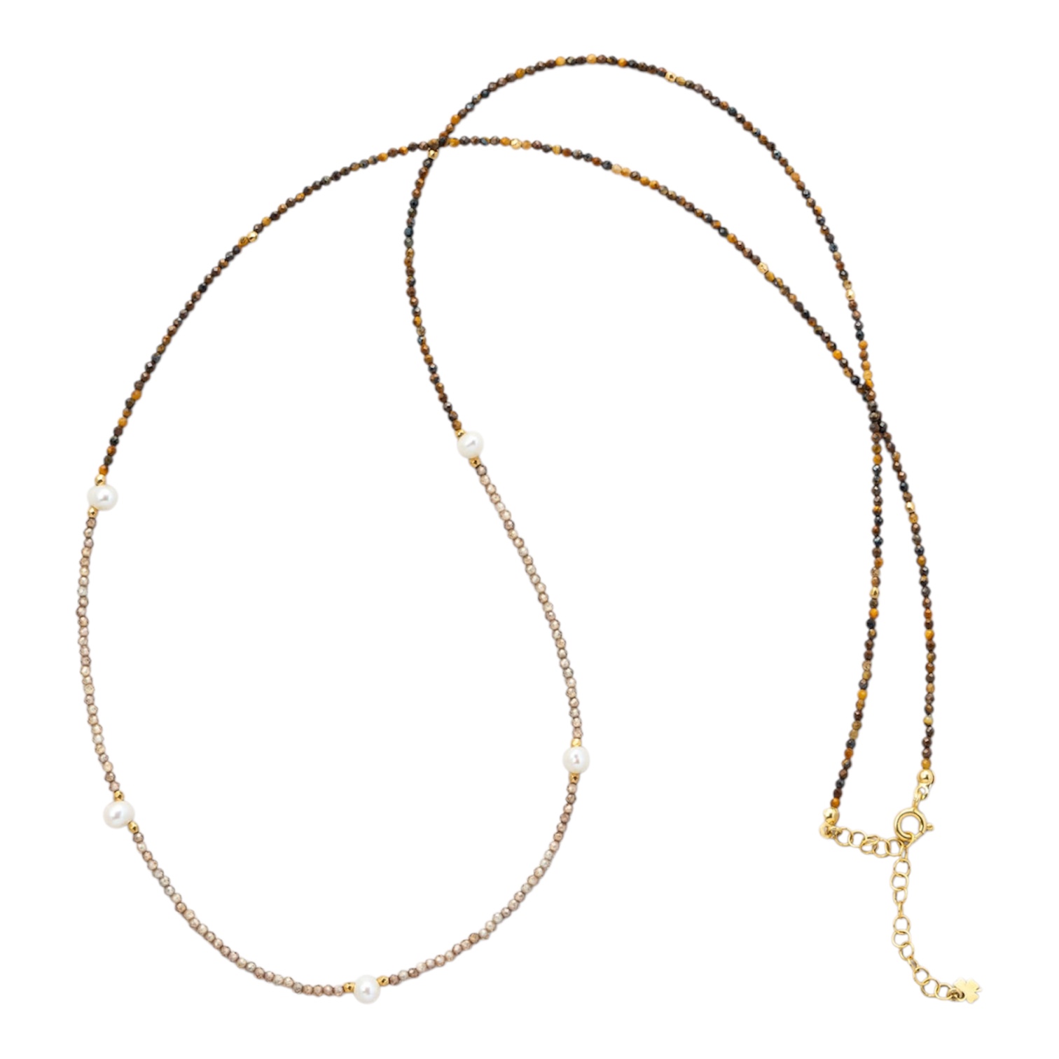Realizzata in argento 925 con galvanica in oro 24Kt, è caratterizzata da due tonalità di pietre semipreziose. A impreziosire la composizione, cinque perle inserite lungo la catena creano un gioco di contrasti morbidi e luminosi.