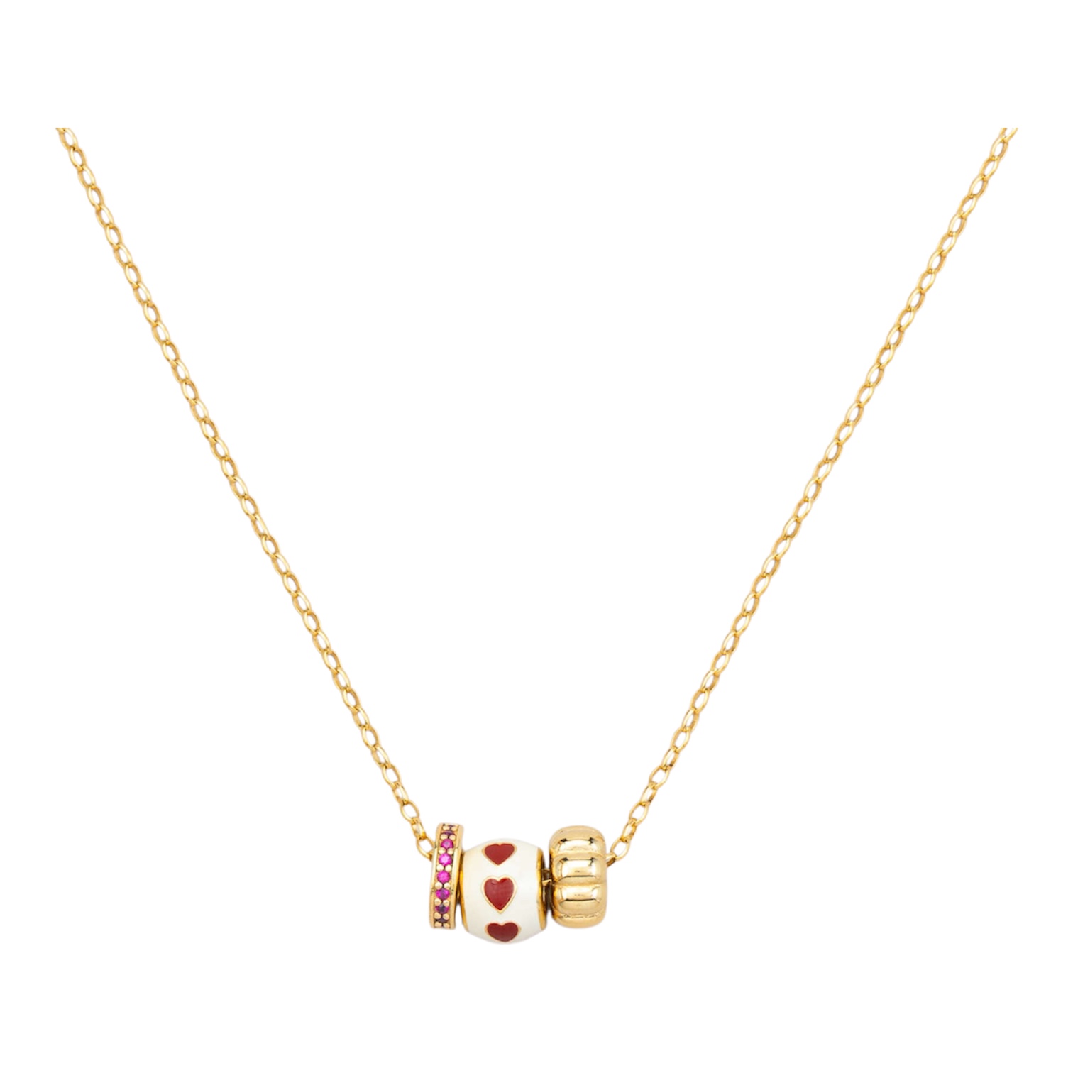 Realizzata in argento 925 con galvanica in oro 24Kt, presenta un rocchetto smaltato a mano in un elegante color panna, decorato con una serie di piccoli cuori smaltati in rosso che circondano la superficie come un abbraccio continuo. E’ accompagnato da due rondelle, una bombata e una circondata da petit rubino. Ogni dettaglio è smaltato a mano, rendendo ogni pezzo unico e speciale.