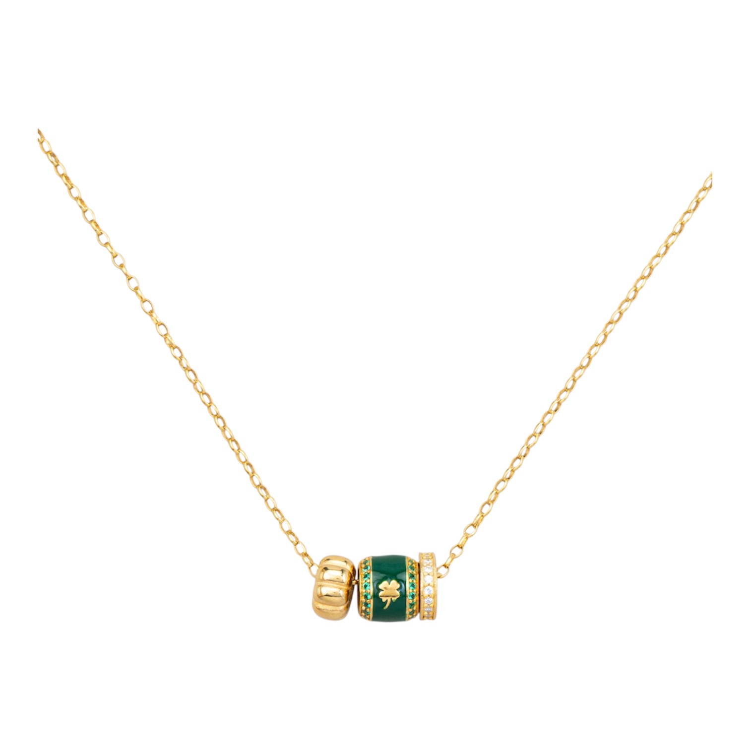 Realizzata in argento 925 con galvanica in oro 24Kt, presenta un rocchetto interamente smaltato a mano in un brillante verde, colore legato alla fortuna e alla rinascita. Al centro spicca un piccolo quadrifoglio color oro mentre ai lati del rocchetto una fila di petit verdi aggiunge tridimensionalità e un delicato gioco di luce. Si aggiungono due rondelle: una bombata e una circondata da petit crystal.
