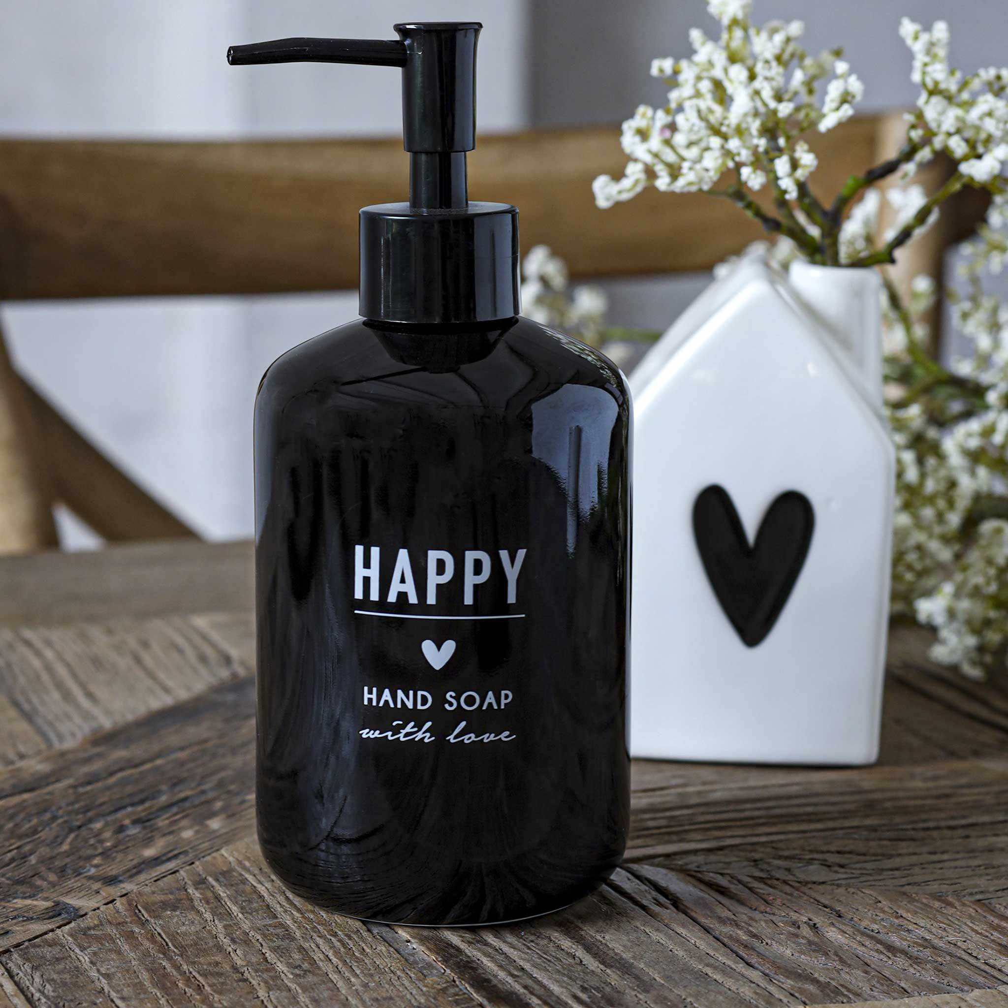 Dispenser nero con decoro “be happy”.
