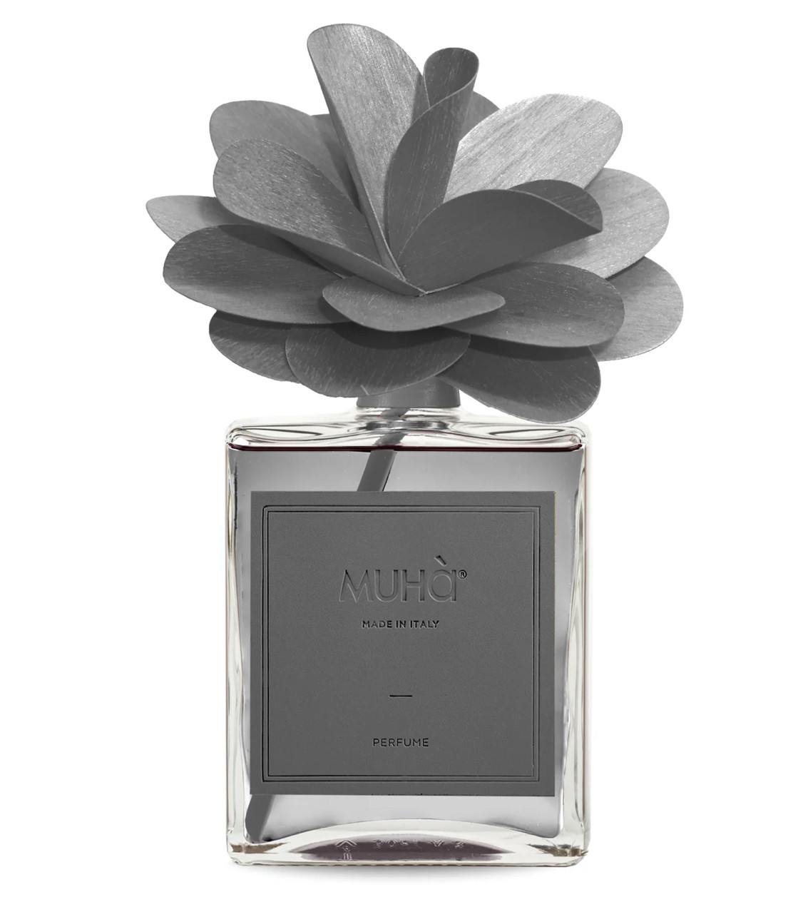 Profumatore d’ambiente in bottiglia di vetro con diffusore a forma di fiore in legno di betulla realizzato a mano.