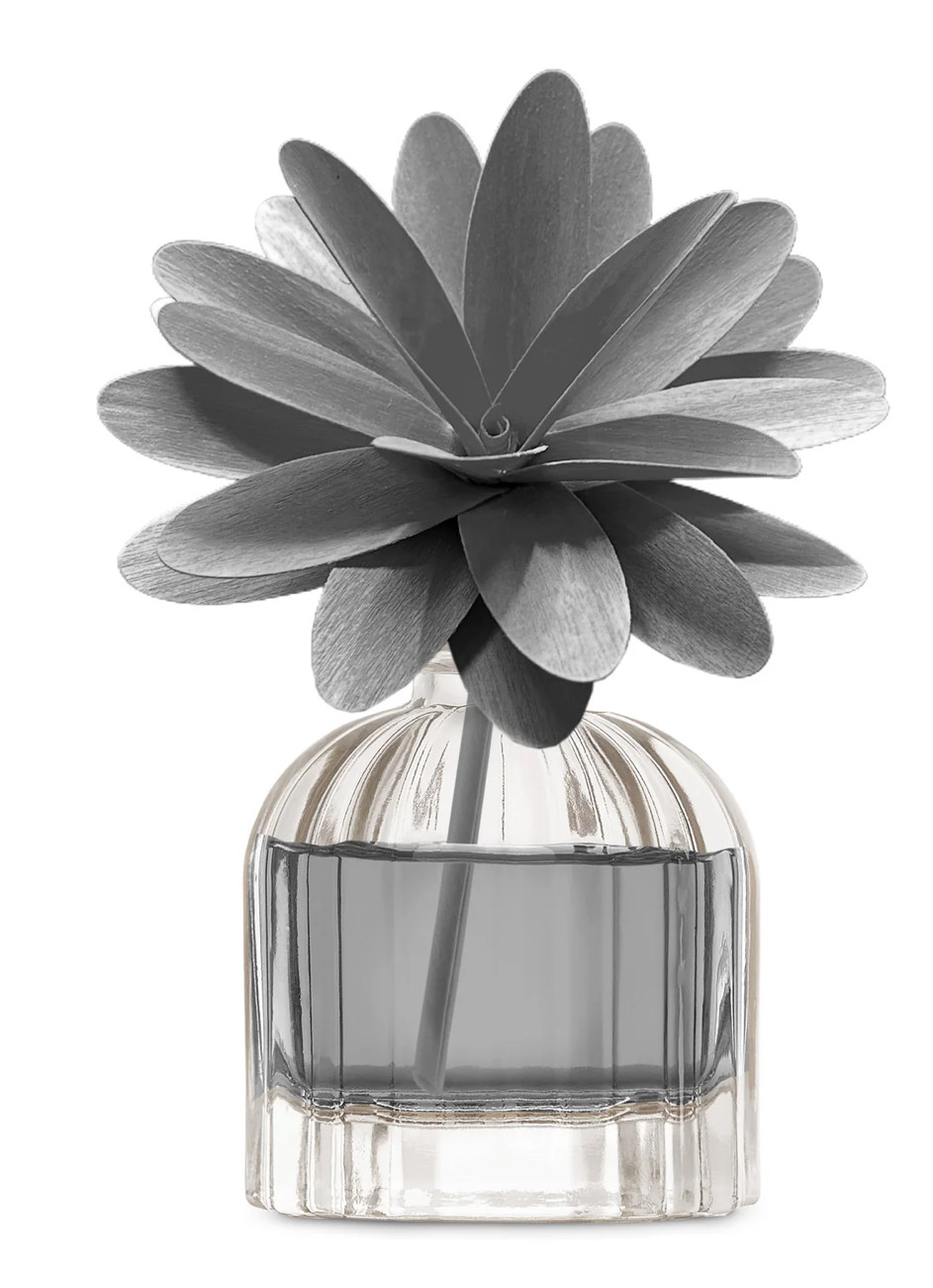 Profumatore d’ambiente in bottiglia di vetro con diffusore a forma di fiore in legno di betulla realizzato a mano.