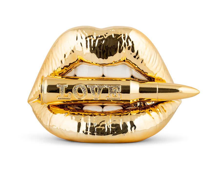 Una bocca dorata, brillante, che stringe tra i denti un proiettile inciso con la parola LOVE: