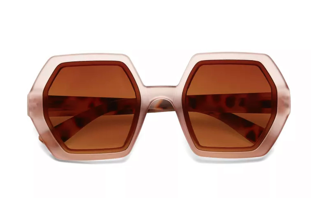 EMMA è un occhiale da sole premontato esagonale con montatura soft touch e lenti overlap.