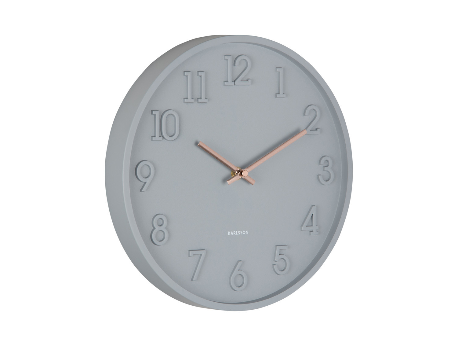 I numeri in rilievo aggiungono una sottile profondità, rendendo il design ancora più sofisticato. Less is more, un orologio perfetto per un arredamento sereno ed elegante.
