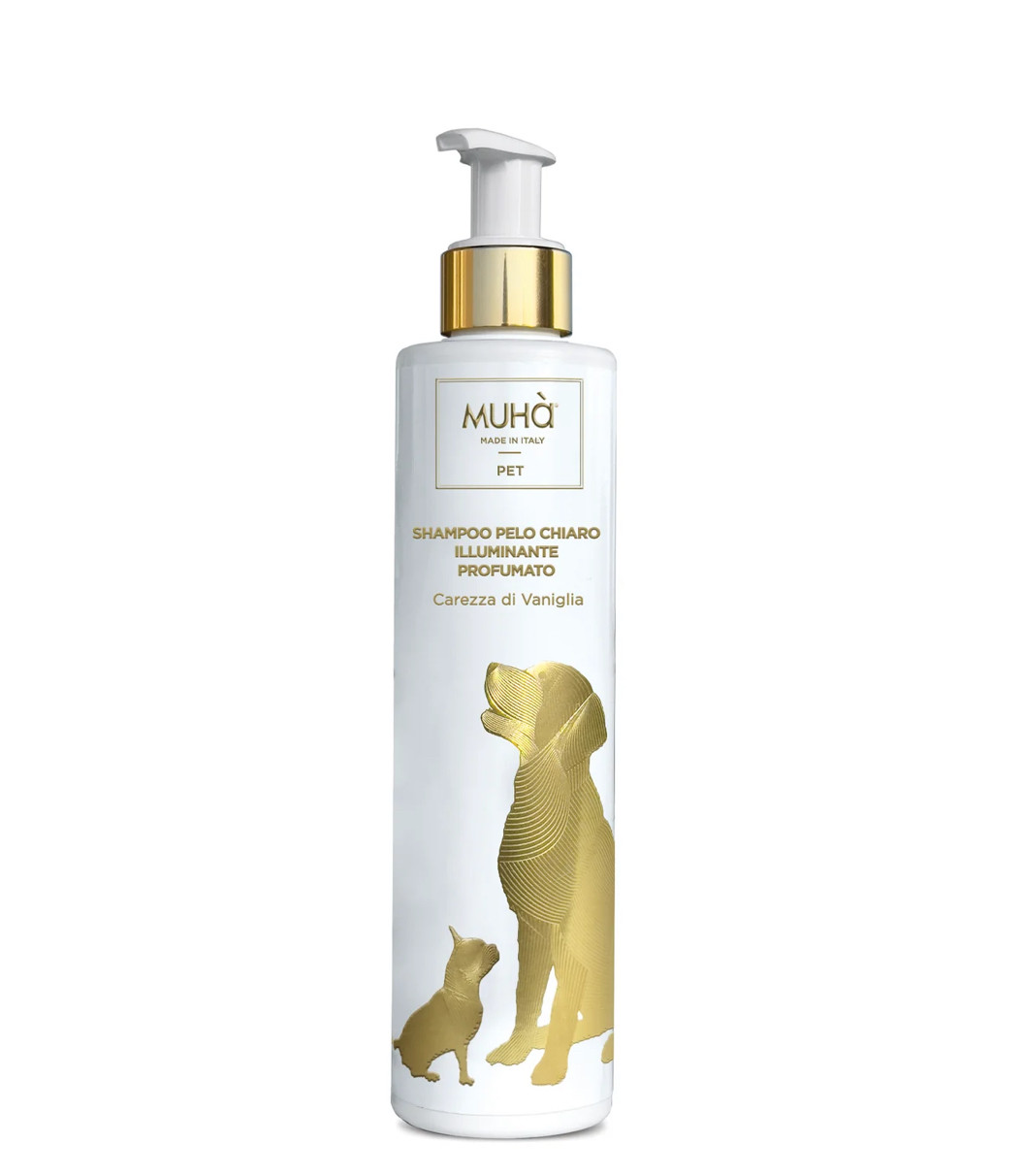 Shampoo specifico per la cura e la bellezza dei manti chiari e bianchi, formulato con aloe vera, estratto di papaya, estratto di calendula e infuso di fiori di camomilla. Ideale per esaltare il candore naturale dei manti bianchi e preservare la luminosità dei manti chiari, garantendo una pulizia delicata e profonda.