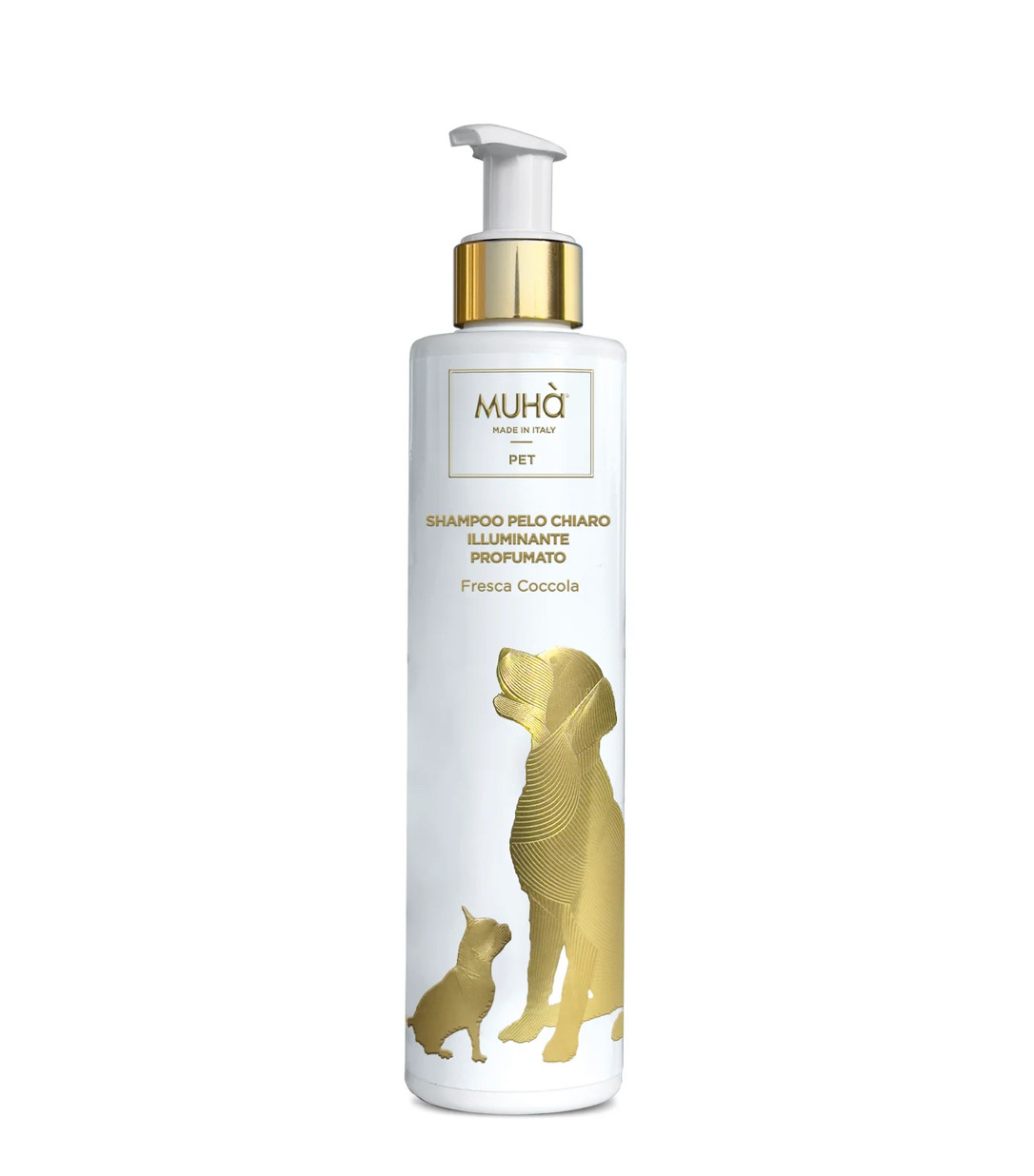 Shampoo specifico per la cura e la bellezza dei manti chiari e bianchi, formulato con aloe vera, estratto di papaya, estratto di calendula e infuso di fiori di camomilla. Ideale per esaltare il candore naturale dei manti bianchi e preservare la luminosità dei manti chiari, garantendo una pulizia delicata e profonda.