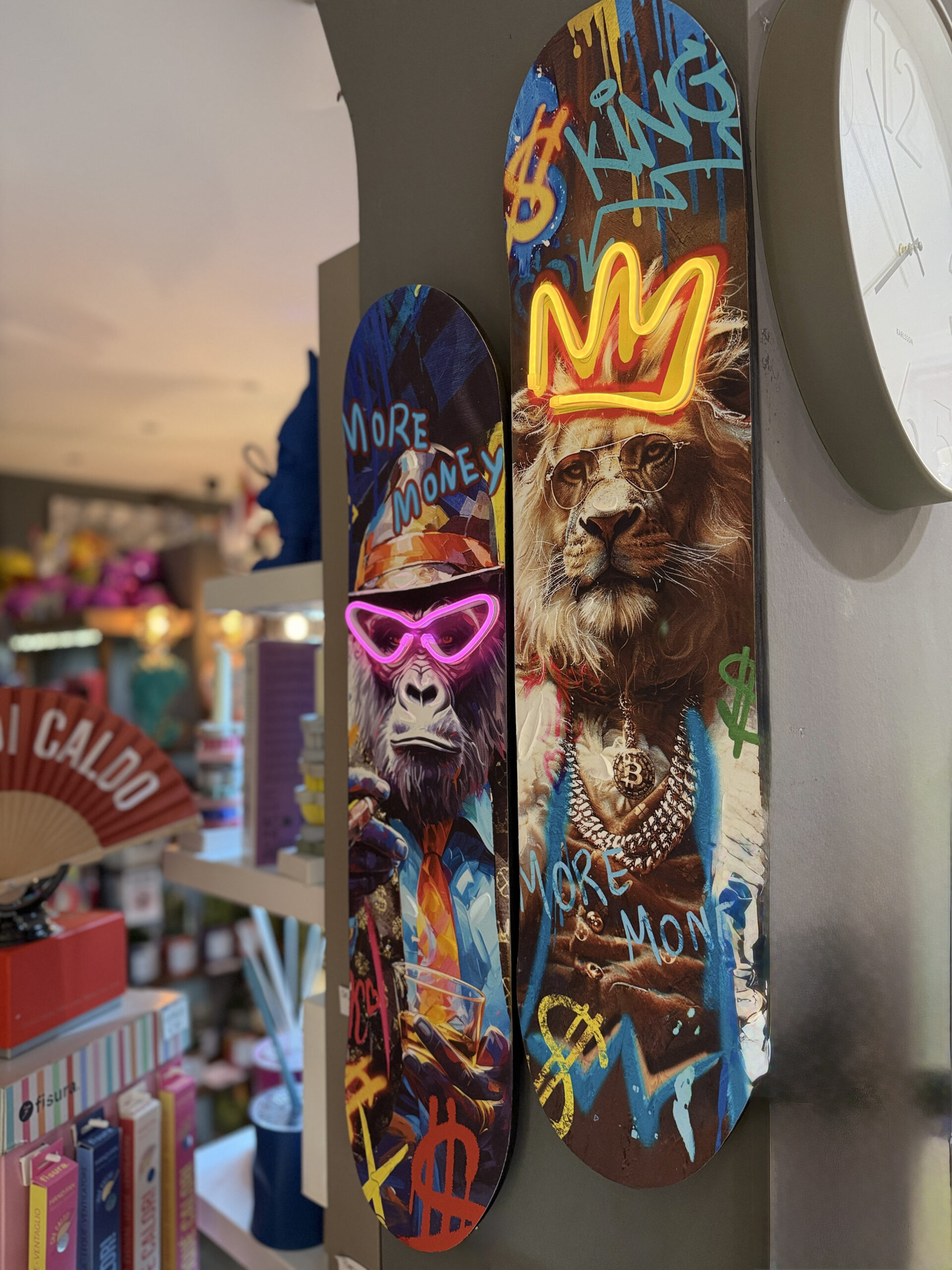 Dotato di illuminazione a LED, questo skateboard artistico trasforma qualsiasi ambiente con il suo carisma iconico.