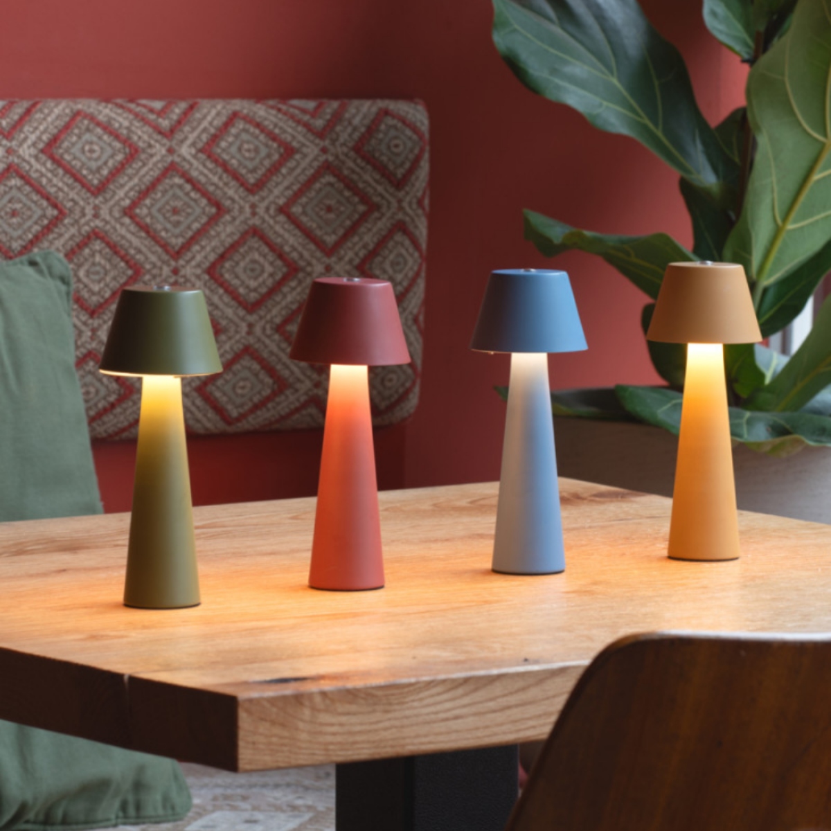 Lampada da tavolo Mini LED CONE, compatta, senza fili ed elegante.