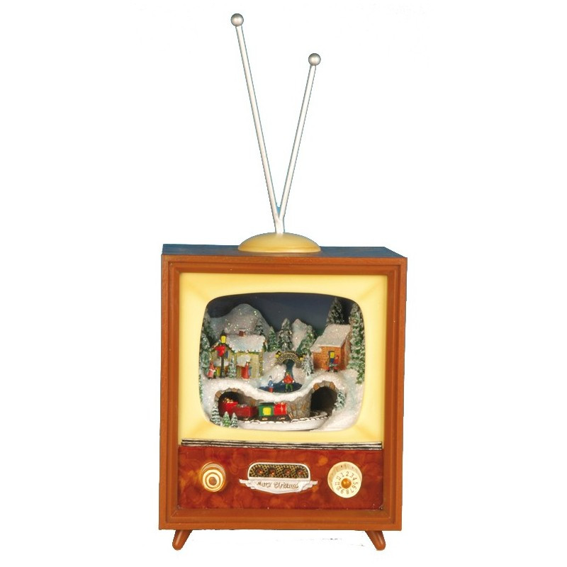 Televisore in resina. La scena di treno all’interno gira e viene illuminata al suono di 8 melodie natalizie elettroniche (Jingle Bells, We wish you a Merry Christmas, Astro del ciel, Deck the Halls, Joy to the world, The first Noel, Hark the herald angels sing, O Albero) con volume regolabile.