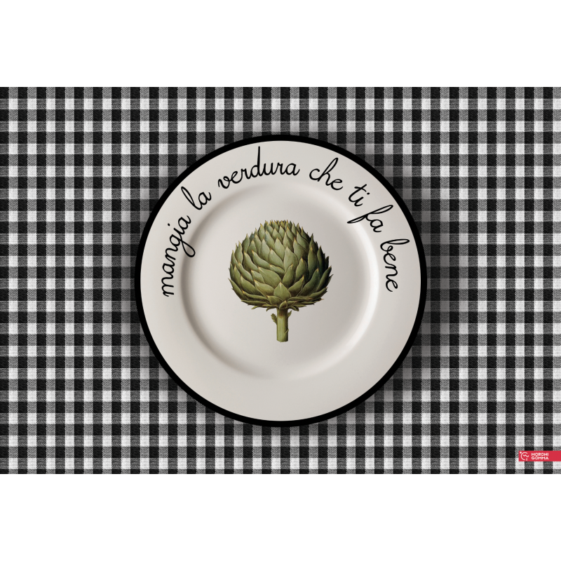 Utilizzando il classico motivo del quadretto bianco e nero e una serie di decori con alcuni dei proverbi o dei modi di dire della tradizione italiana.